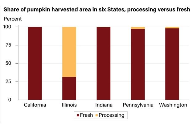 Illinois harvests the largest share of pumpkin acreage among all States and an even larger share of processing acres. The most recent available data indicate that almost 70 percent of pumpkin acres in Illinois are devoted to varieties destined for pie filling or other processing uses—compared with about 3 percent in Pennsylvania and even less in Washington, Indiana, and California. This difference in the type of pumpkin most commonly grown in Illinois helps to explain differences in yield and price between Illinois and other top States.
