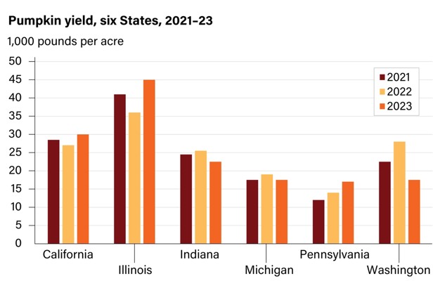 Yields vary substantially among States and over years within a State, depending on pumpkin varieties and growing conditions. On average for the period 2021–23, rounded to the nearest five thousand, Illinois grows about 40,000 pounds per acre (predominantly pie varieties for processing into products like pumpkin puree). California grows about 30,000 pounds per acre on average, Indiana and Washington about 25,000, Michigan about 20,000, and Pennsylvania about 15,000 pounds per acre. Yield can vary each year, rounded to the nearest hundred—from as much as 10,500 pounds per acre in the case of Washington from 2022 to 2023—to as little as 1,000 pounds per acre in the case of Indiana from 2021 to 2022.