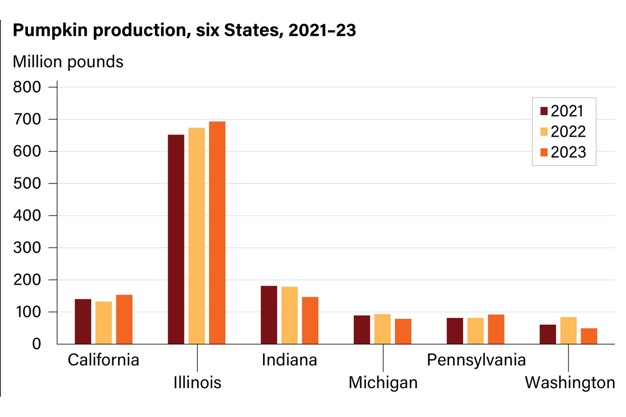 In 2023, farmers in the top six pumpkin-producing States harvested more than 1.2 billion pounds of pumpkins combined. Leading in pumpkin acreage harvested and yield, Illinois produced about 690 million pounds in 2023, more than the other 5 most productive States combined. California and Indiana each produced about 150 million pounds—while Pennsylvania produced about 90 million pounds and Michigan produced about 80 million pounds. Washington's production dropped 42 percent from 2022 to 2023, falling to about 50 million pounds.