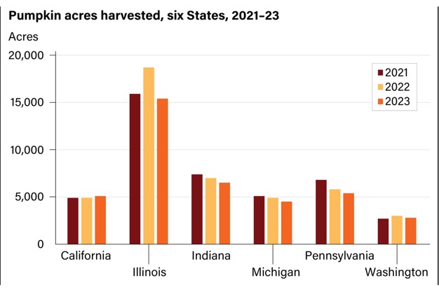 In 2023, Illinois maintained its leading position in pumpkin acreage, harvesting more than twice as many pumpkin acres as any of the other top States, at 15,400 acres. In the same year—California, Indiana, Michigan, Pennsylvania, and Washington—each harvested between 2,800 and 6,500 acres.