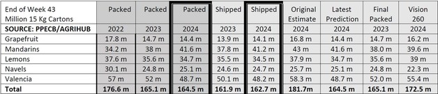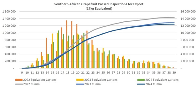 Grapefruit packing for export was estimated at 14.8 million cartons (17-kilogram equivalents), almost 14% up on last year's 13.0 million cartons. This was due to the recovery from the dry conditions experienced in the northern areas in previous years. The estimate (prepared in mid-March) also anticipated the crop will be similar to the 2022 season. The estimated volumes for 2024 include volumes available for processing (PP grade or Class 3).