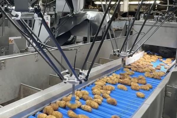 The SiftAI system uses delta robots combined with an AI-based vision inspection system. Each system is programmed with AI models to assess potato size, and shape, and detect defects such as bruises, cracks, and discoloration. Installed over a roller table, SiftAI cameras capture images of all sides of the potato. Potatoes that fall outside the set grading criteria are automatically removed by robotic arms, capable of up to 80-100 picks per minute with two robot configurations.