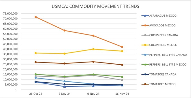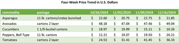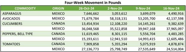 Movement from Mexico crossings through Arizona, California, and Texas is expected to remain about the same. Trading is moderate. Prices are lower. 11-pound cartons/crates of bunched standard are 20.75. Extra services are included. Prices represent few spot market sales. Movement from Peru imported through South Florida ports of entry is expected to decrease slightly. Trading is moderate. Prices of large and standard are slightly higher, jumbo and extra-large are slightly lower, small is generally unchanged. 11-pound cartons of bunched jumbo are mostly 25.75-30.95, extra-large are mostly 23.50-26.75, large are mostly 23.75-24.95, standard are mostly 21.75-23.75, small are 17.75-18.75. Supplies of large are fairly light. Quality is generally good.