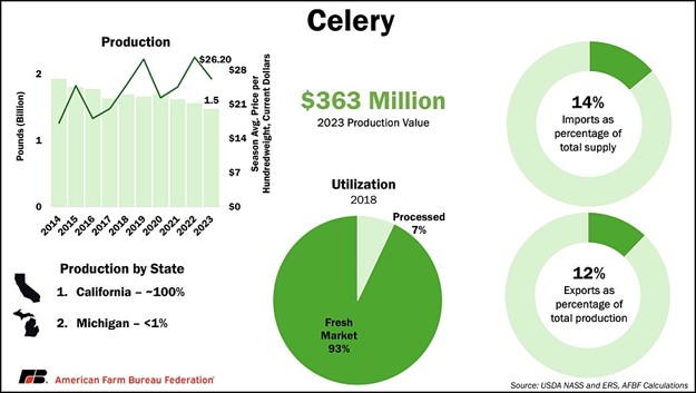Today, most domestically produced celery grows nearly year-round on over 20,000 acres on the central and southern coasts of California. The state is so dominant in celery production that USDA's National Agricultural Statistical Service only provides data for California-grown celery. Despite this reporting, growers in Michigan (1,100 acres) also produce celery. Most celery goes into the fresh market, and 86% of the celery supply in the United States is produced domestically.