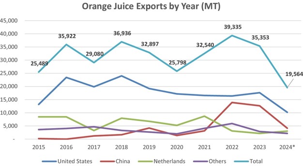 Industry sources anticipate greater difficulty securing sufficient labor as well as higher wages for scarce pickers in MY 2024/25 and possibly in subsequent crops. Labor availability was less of a factor in MY 2023/24 because of the smaller-than-expected crop. Producers expect more stable costs of production in MY 2024/25, as the cost of fuel and fertilizer throughout 2024 remained similar or lower than in the previous year. However, the high cost of agrochemicals and the limited availability of molecules to fight citrus greening continues to challenge growers.