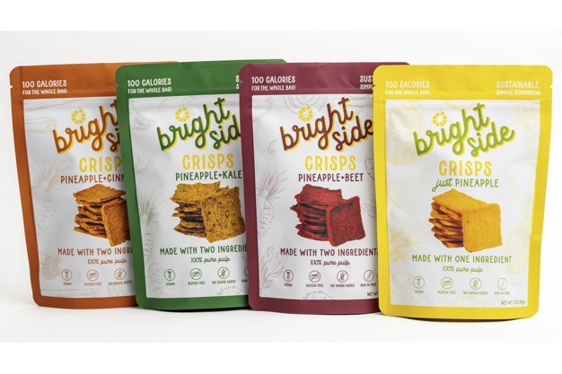 Bright Side Snacks are a new kind of fruit crisp cracker made simply with fruit and vegetable pulp. All flavors are made with only one or two ingredients: just pineapple, pineapple and beet, pineapple and kale, pineapple, and cinnamon. Furthermore, the product offers a sustainable solution by utilizing pineapple pulp and other pulp that would otherwise be thrown out after the fruit or vegetable is juiced.