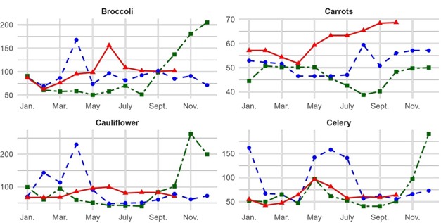 In 2024, the fresh market vegetable sector experienced a mixed year, with notable increases in grower prices for key crops like lettuce, onions, carrots, and tomatoes due to unfavorable growing conditions. Cauliflower and celery experienced stable or declining prices, but overall availability met consumer demand despite regional disruptions.