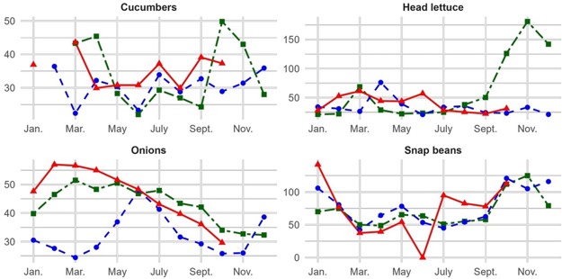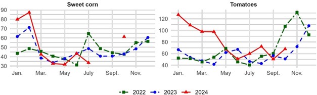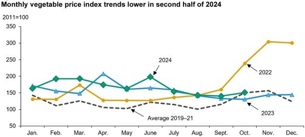 During the first 4 months of 2024, changes in fresh vegetable prices varied by crop. While tomatoes and onions started the year at elevated levels, with tomatoes stabilizing by midyear and onions gradually declining after their early peak, carrot prices have steadily risen beyond the first quarter. Other fresh vegetables, including celery and cauliflower, have generally seen prices rise above their 2023 averages throughout much of 2024. These price increases led to a 7.6 percent increase from September 2024 to October 2024 in the USDA, National Agricultural Statistics Service (NASS) vegetable price index, which represents an aggregate measure of fresh vegetable prices. The October 2024 index was 16 percent higher than last year, but 37 lower than October 2022.