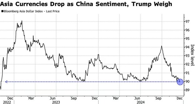 An index tracking Asian currencies against the US dollar has reached its lowest point in over two years, driven by concerns over China's economic prospects and the potential impact of policies from the incoming Trump administration. The Bloomberg Asia Dollar Index declined to 89.9091, marking a decrease of over 4% since the end of September and signaling the poorest quarterly performance in this period.