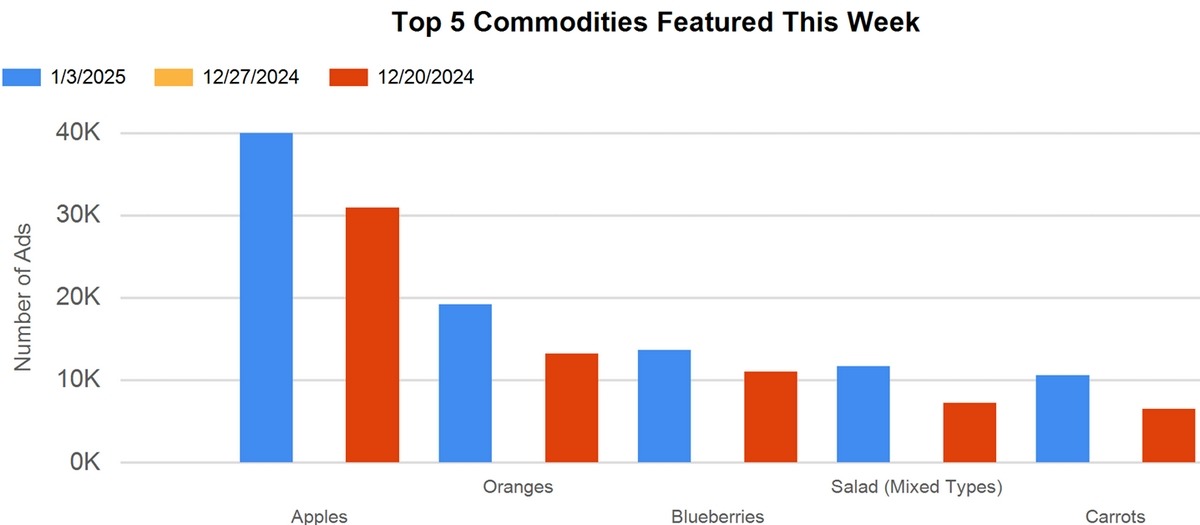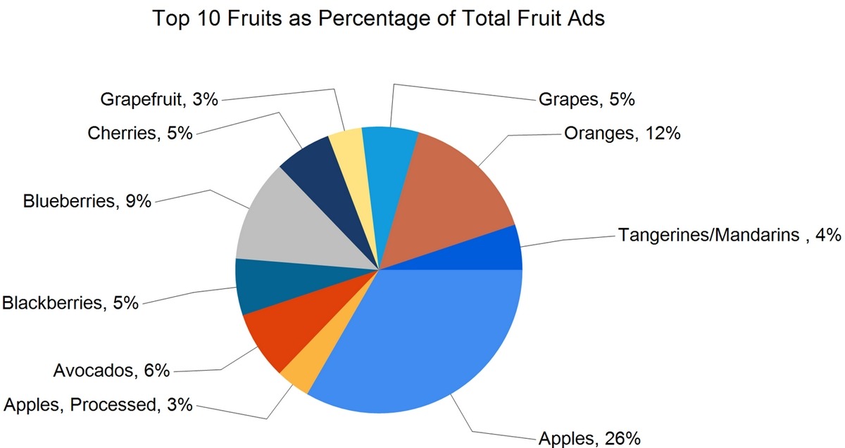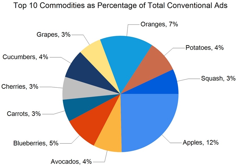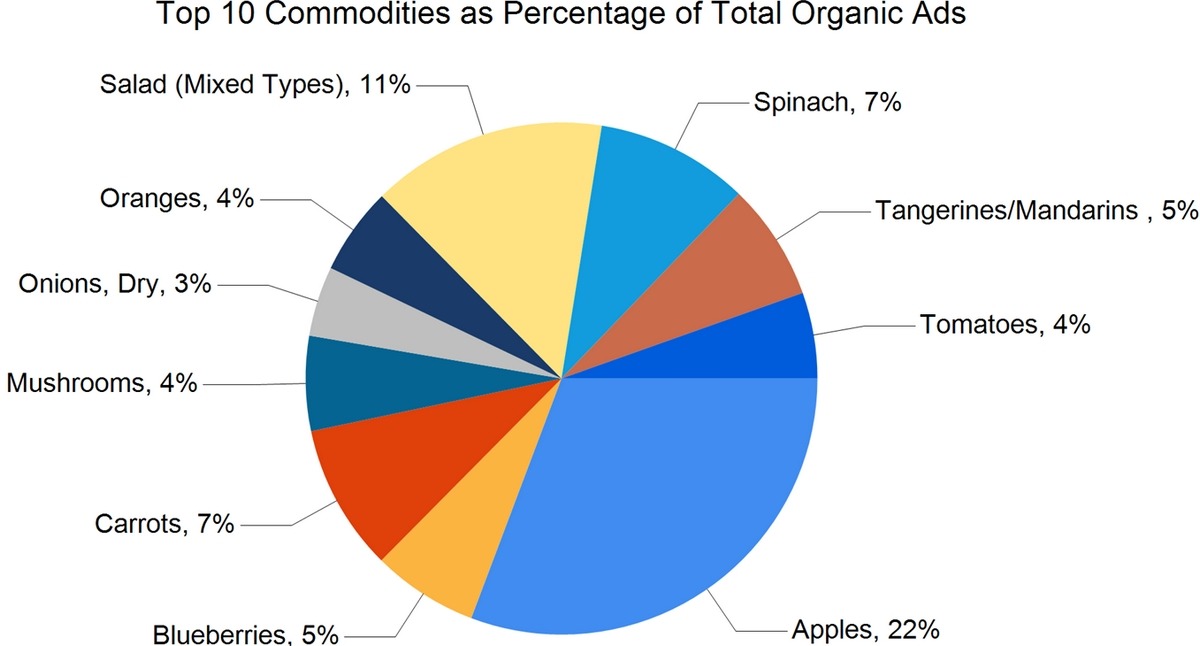 Total ad numbers this week were 289,415. The total for the same week last year was 7% higher at 312,265. The total number of ads broken out by commodity groups: fruit 156,735 (54%), onions and potatoes 18,954 (7%), vegetables 110,526 (38%), herbs 1,728, ornamentals 922, and hemp 2,278. The number of ads for organic produce was 53,647, 19% of total ads.