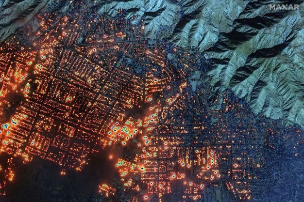 Satellite image from Maxar Technologies shows how the Eaton wildfire has set nearly every building in western Altadena on fire.