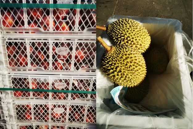 Left: Chilean nectarines; Right: Malaysian fresh Musang King durian