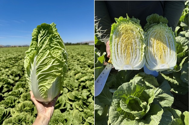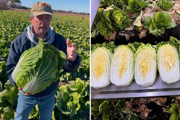 Jeff Hitchcock, founder and CEO of Hitchcock Farms, in a Yuma, AZ field last week holding Napa cabbage that this year is near twice the size and weight of what is normally packed.
