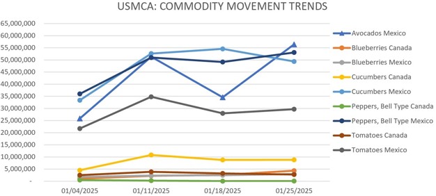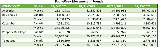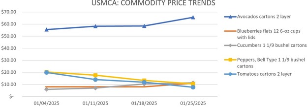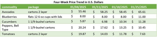 Movement from Mexico crossings through Texas is expected to increase in order to meet increased retail demand in mid-February for the end of the professional football season. Trading is active at lower prices. Prices are lower. Cartons 2-layer Hass 32s are mostly 84.25-85.25, 36s are mostly 83.25-85.25, 40s are mostly 77.25-78.25, 48s are mostly 72.25-74.25, 60s are mostly 59.25-61.25, 70s are mostly 36.25-38.25, and 84s are mostly 25.25-26.25; organic 48s are 80.25-85.25. Extra services are included.