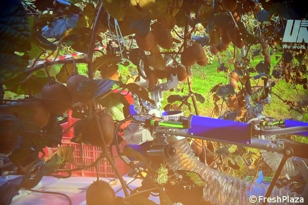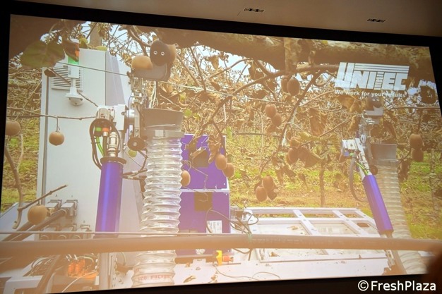 Robotic harvesting test on kiwis (photo taken from video projected by Unitec during the conference)