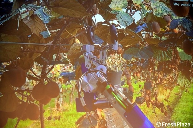 Robotic harvesting test on kiwis (photo taken from video projected by Unitec during the conference)