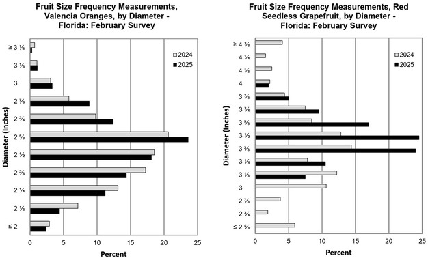 Non-Valencia orange production increased by 100,000 boxes to 4.60 million. A Row Count survey conducted on February 26–27, 2025, indicated that nearly all early and mid-season non-Valencia rows (excluding Navels) are harvested. The Navel orange forecast within this category remains at 100,000 boxes.
