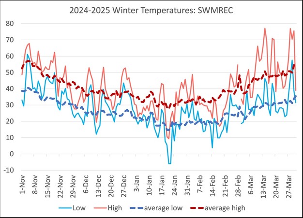 The winter of 2024–2025 was relatively typical for the region. Temperatures stayed close to long-term averages, rarely deviating more than 10 degrees. The coldest period occurred on January 21–22, when lows dropped to around -6°F. According to MSU, this cold snap is not expected to cause significant bud damage. Winter precipitation was also near average, with December bringing above-average rain and snow, while the rest of the season saw near or below normal levels. Much of Michigan's Lower Peninsula entered winter in drought, and those conditions remain largely unchanged as of March 27.