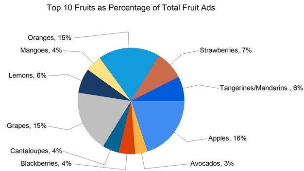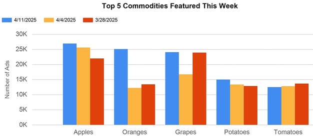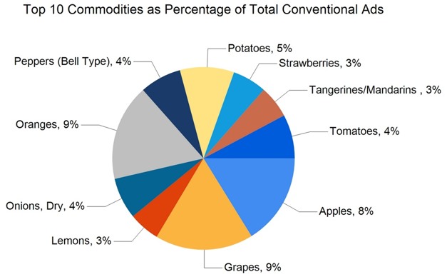 Total ad numbers this week reached 304,073—a 7% increase from last week's total of 284,354 and 5% higher than the same week last year (288,391). Ads by commodity group were as follows: fruit 164,098 (54%), vegetables 104,488 (34%), onions and potatoes 25,759 (8%), herbs 760, ornamentals 5,995 (2%), and hemp 3,733. Ads for organic produce totaled 36,732, making up 12% of all ads.