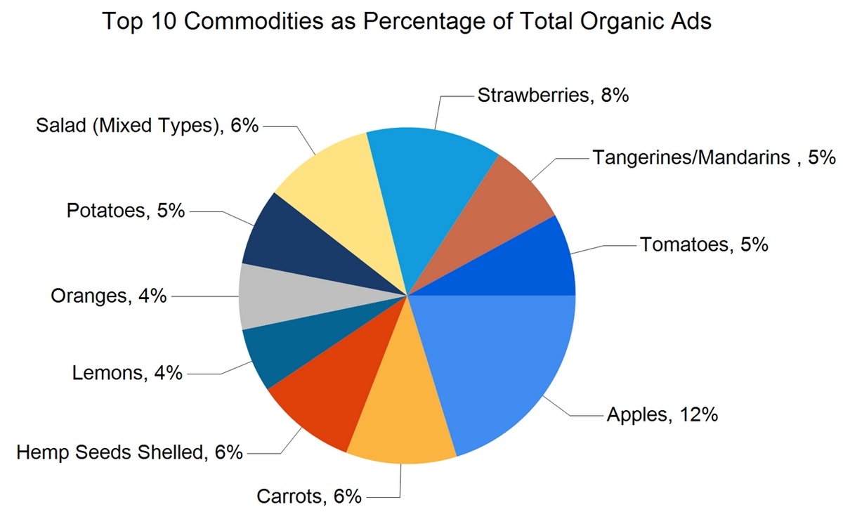 Total ad numbers this week reached 304,073—a 7% increase from last week's total of 284,354 and 5% higher than the same week last year (288,391). Ads by commodity group were as follows: fruit 164,098 (54%), vegetables 104,488 (34%), onions and potatoes 25,759 (8%), herbs 760, ornamentals 5,995 (2%), and hemp 3,733. Ads for organic produce totaled 36,732, making up 12% of all ads.