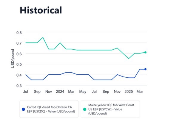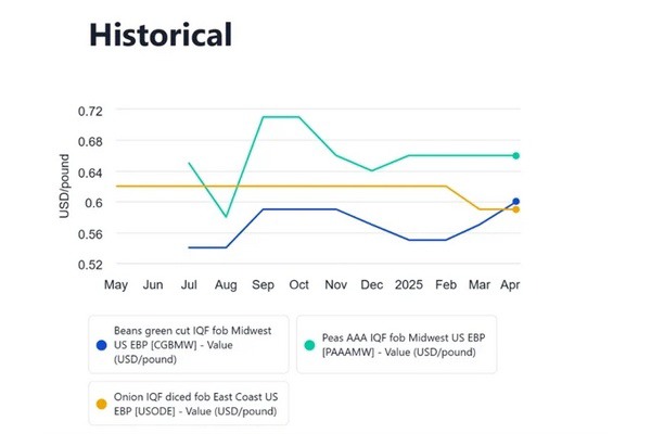 In 2025, IQF vegetable price trends showed moderate fluctuations. Carrot IQF diced fob Ontario, CA prices rose from $0.37/lb to about $0.45/lb by April. Maize (sweetcorn) yellow IQF fob West Coast prices recovered, reaching $0.61/lb in March. Beans, green cut IQF fob Midwest showed slight upward movement, whereas Peas AAA IQF fob Midwest remained stable. Onion IQF diced fob East Coast saw a price decline from $0.62/lb to about $0.59/lb by April. Overall, 2025 IQF prices exhibited mild increases, except for onions, which trended downward.