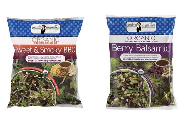 The Sweet & Smoky premium salad kit mixes organic leafy greens with crispy onions, white cheddar cheese, and dried corn dressed with a sweet and smoky barbecue-flavored vinaigrette. The Berry Balsamic salad kit mixes organic leafy greens with sliced almonds, dried cranberries, Bing cherries, and blueberries, and a raspberry balsamic vinaigrette.