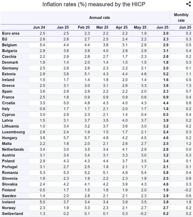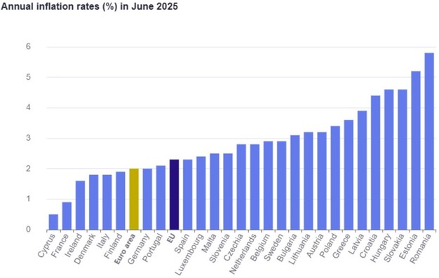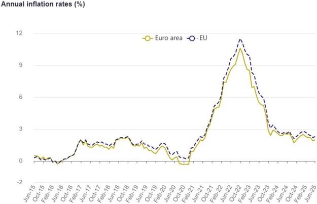 The euro area annual inflation rate was 2.0% in June 2025, up from 1.9% in May. A year earlier, the rate was 2.5%. European Union annual inflation was 2.3% in June 2025, up from 2.2% in May. A year earlier, the rate was 2.6%. These figures are published by Eurostat, the statistical office of the European Union.