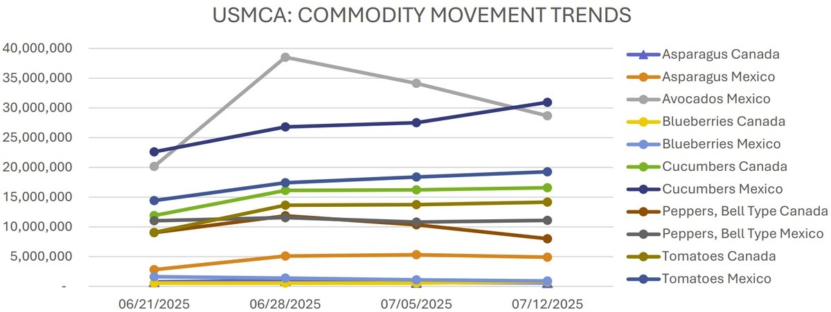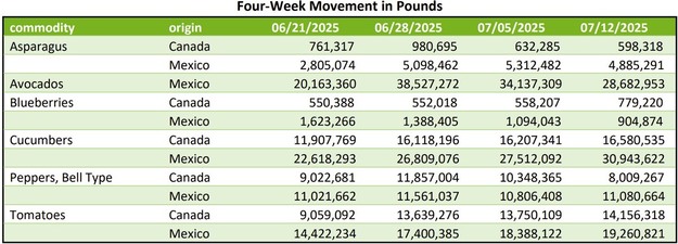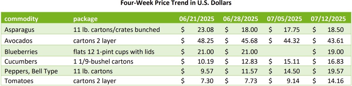 Movement from Mexico through Arizona, California, and Texas is expected to remain steady. Early trading was moderate but slowed later in the week, with prices trending lower. Eleven-pound cartons/crates that are large are mostly $18.75–$20.75, and standard are $14.75–$16.75. Some open sales were booked with prices yet to be determined. In contrast, imports from Peru through Southern California ports are steady with moderate trading and slightly higher prices. Jumbo bunched are $34.00–$36.75, extra-large mostly $28.00–$30.00, large at $22.00–$22.95, and standard mostly $20.00.