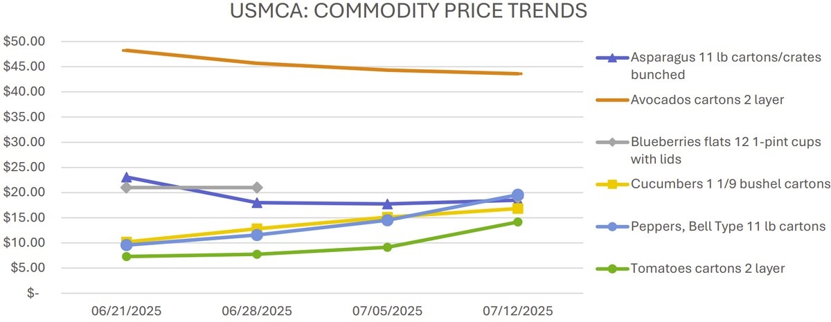 Movement through Otay Mesa, California, is steady. Trading was moderate early but slowed later. Prices for 36s are lower; 1 1/9-bushel cartons of medium are mostly $14.00–$15.00, large $13.00–$14.00, and fair quality $12.00. Cartons of 36s are mostly $8.00. Through Texas, movement is expected to decrease. Prices for medium are mostly $17.95–$18.95, fair quality $14.95–$15.95, ordinary quality $8.95–$9.95, and large mostly $20.95–$22.95.