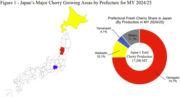 In 2024/25, Japan imported 4,754 tons of cherries, 93 per cent from the United States. For 2025/26, imports from the U.S. are forecast to decline 10.5 per cent to 4,300 tons due to reduced shipments from California.