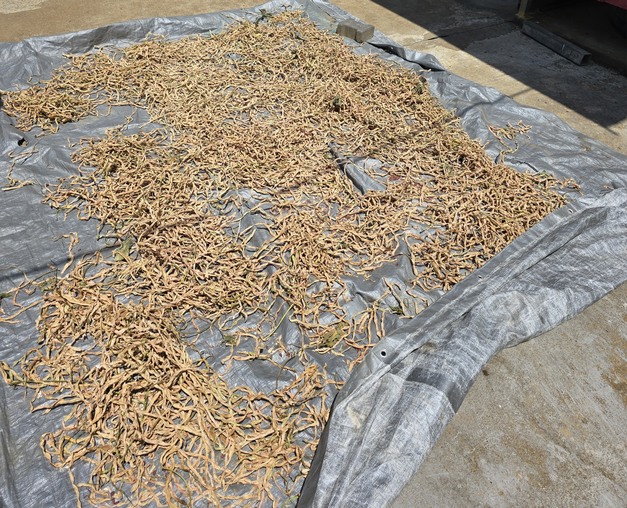 Long beans lie out to dry. Seeds are extracted from the dried vegetables for the next harvest.