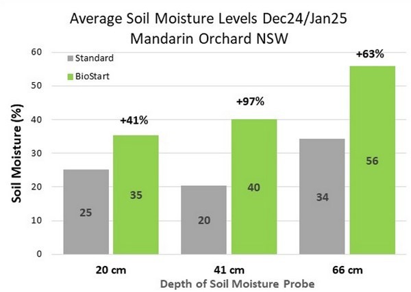 Soil sensors recorded increased moisture across all measured depths: 25% untreated versus 35% treated at 20 cm (a 41% increase); 20% untreated versus 40% treated at 41 cm (a 97% increase); and 34% untreated versus 56% treated at 66 cm (a 63% increase).