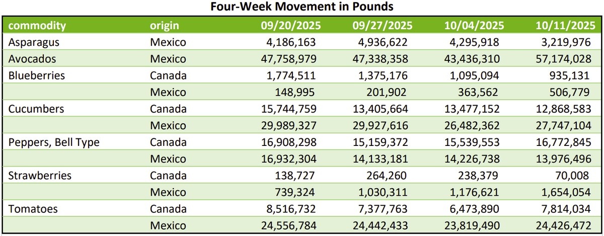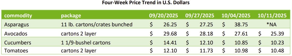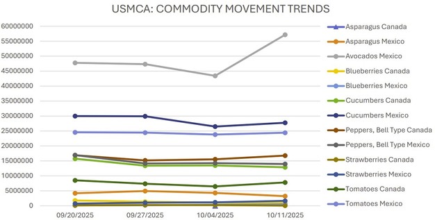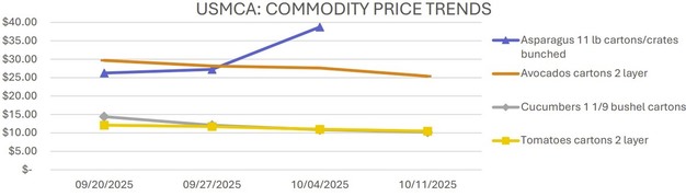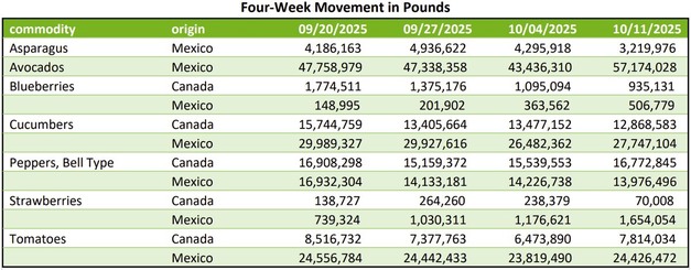 Movement from South Georgia is increasing seasonally, with prices mostly US$10.35–11.35 for jumbo and extra-large and US$6.35–8.35 for fair quality. Mexican movement through Nogales, Arizona, is also set to increase, while California's Coachella Valley harvest begins the week of October 19.