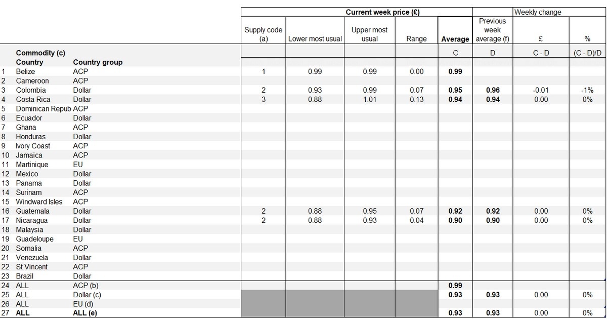 The latest banana market data show no major price changes across key origins this week. Average prices remained stable at £0.93 per kilogram, with most supplying countries maintaining last week's levels.