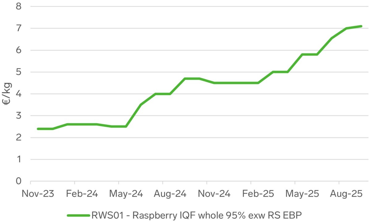 The reduced supply has led to higher prices since June. Expana Benchmark Prices (EBP) for Raspberry IQF whole 95% exw Serbia [Expana code: RWS01] stood at around US$7.63/kg (€7.10/kg) on September 30, up 51% year-on-year.