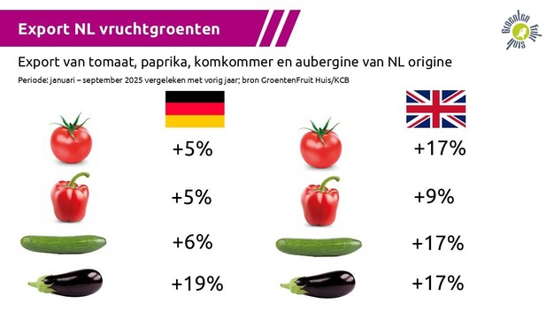 Dutch exports of tomatoes, cucumbers, peppers, and aubergines have increased sales in Germany and the UK this year. This is according to information from GroentenFruit Huis based on export figures (volume) for the period from January to September 2025.