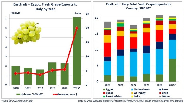 Egypt's fresh grape exports to Italy increased sharply in 2025, with volumes reaching more than 7,000 tons between January and July, according to EastFruit. Exporters generated nearly US$20 million during this period. Shipments were three times higher than in the same period last year and exceeded the combined total of the previous three seasons. This marks a new record for Egyptian grape exports to Italy.