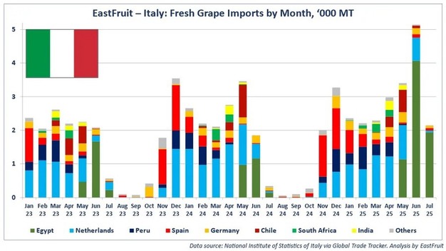 This year, a delayed domestic season in Italy allowed Egypt to continue exporting into July. During that month, Egypt supplied 90 percent of Italy's grape imports. As a result, Egypt set a new export record and became Italy's leading supplier of fresh grapes in the first seven months of 2025.