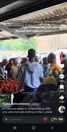 Right: a trader of "fruit and clothing" fled the scene and abandoned his stock "when asked for immigration papers" (source: Alpha Ramushwana TikTok)