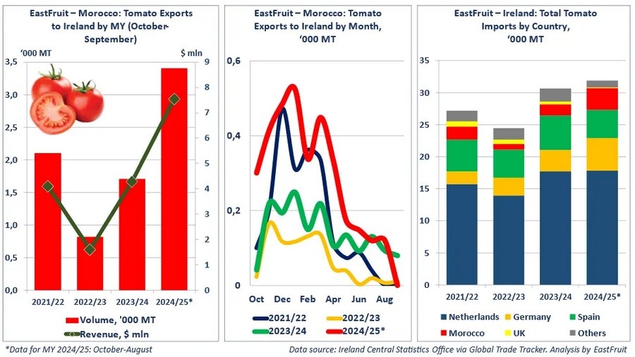 Morocco has reached a new seasonal high in tomato exports to Ireland, doubling volumes compared to the previous year. From October 2024 to August 2025, exports totalled 3,400 tons, with a value of US$7.5 million. This shipment volume is twice that of the previous season and surpasses the earlier record from 2020/21 by 62 per cent.