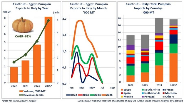 Egypt has continued to expand its pumpkin exports to Italy, setting a new record for the third year in a row, according to EastFruit. Between January and August 2025, exporters shipped more than 8,000 tons of pumpkins to Italy, valued at nearly US$5 million. The volume is three times higher than in 2023 and four times higher than in 2022. It also exceeds the previous record set in 2024 by 73 per cent. Over the past three years, Egypt's average annual growth rate in pumpkin exports to Italy has reached 62 per cent.