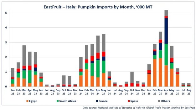 Egypt has become Italy's leading pumpkin supplier. Its market share increased from 14 per cent in 2022 to 26 per cent in 2024. In the January to August 2025 period, Egypt supplied 46 per cent of Italy's pumpkin imports. Other suppliers included South Africa, France, Spain, and the Netherlands. In total, Italy imported pumpkins from 24 countries during the first eight months of the year.