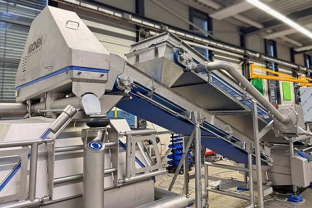 A new GEWA 4000 B PLUS washer was added, equipped with a fine-particle removal system, water management and recycling features, an insect drum, and a circulation pipe system adapted for the facility's tubular heat exchanger. Its discharge belt includes a suction unit to begin water removal. Washed product transfers directly onto the buffer belt of the drying system.