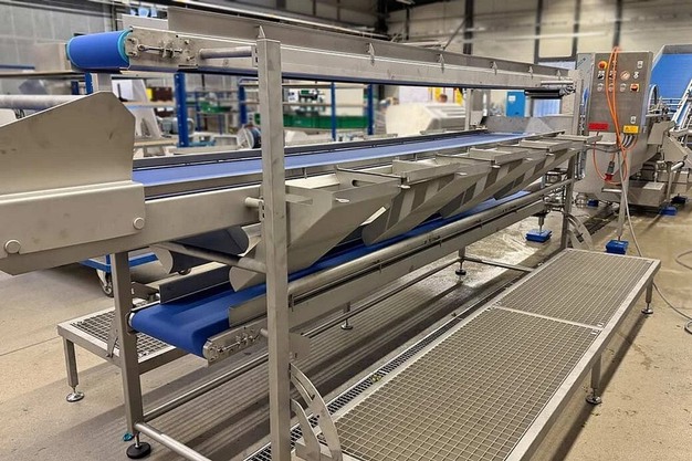 The installation includes a six-person trimming table modified to match the floor conditions and allow effective transfer of raw material to an existing cutting machine. An already installed weighing belt was reworked into an inclined conveyor, while an additional transport belt was added for continuous operation. The company also integrated an existing Kronen GEWA 4000 V washing machine, which was adapted to the new control configuration.