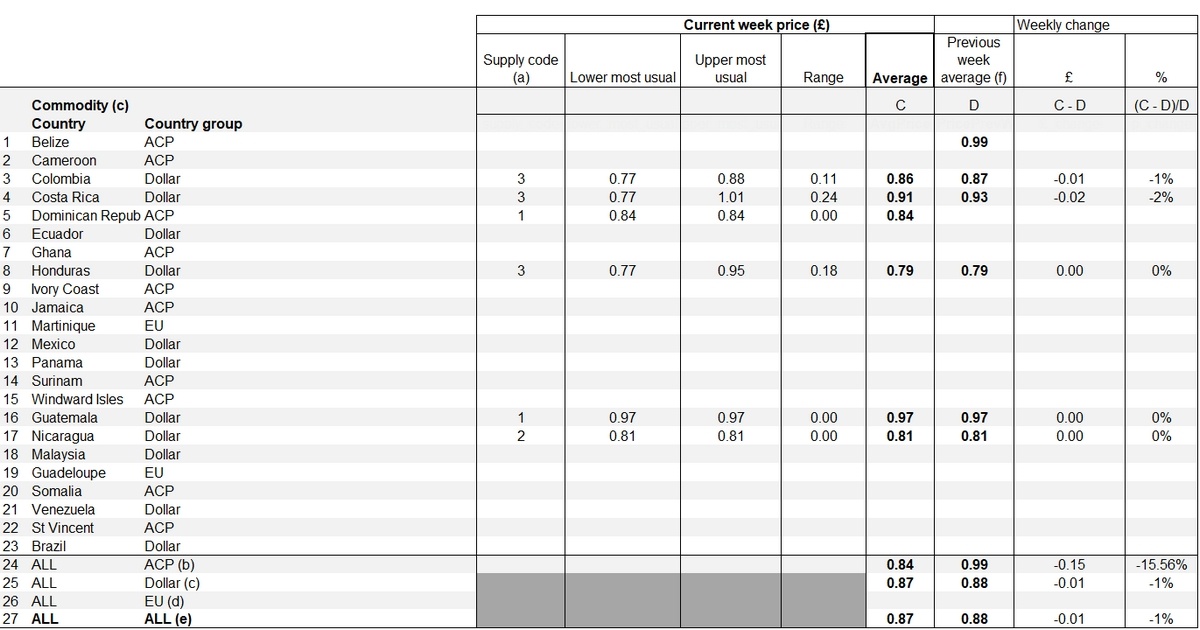 Among individual suppliers, Honduras maintained a stable average price of £0.79, unchanged from the previous reporting period. Colombia's average also held steady at £0.86. Guatemala and Nicaragua, both Dollar suppliers, showed no variation week-on-week, with prices at £0.97 and £0.81 respectively. Several EU suppliers, including Martinique and Guadeloupe, did not report new figures for this period.
