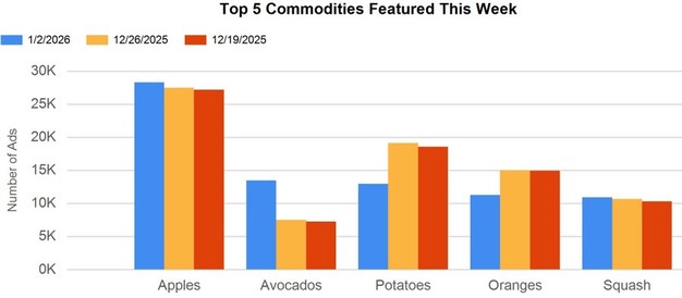 Healthy eating themes featured prominently in retail promotions this week, supported by the wide availability of fresh produce across multiple categories. New-crop items such as Chilean cherries, Florida strawberries, and Texas grapefruit were among the key seasonal offerings. Retailers also highlighted produce linked to bowl game gatherings, including avocados and cilantro for guacamole, as well as snack tray staples such as baby carrots, berries, grapes, and broccoli.