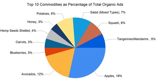 By commodity group, fruit accounted for 138,759 ads, or 54 percent of the total. Vegetables followed with 87,742 ads, representing 34 percent. Onions and potatoes accounted for 21,466 ads, or 8 percent. Herbs totaled 2,118 ads, ornamentals 1,242, hemp 3,069, and honey 2,524. Organic produce was featured in 44,488 ads, accounting for 17 percent of total advertised items.