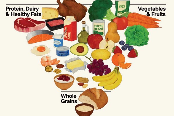 The new DGA's upside down pyramid for eating prioritizes fruit and vegetable consumption by recommending two servings of fruit and three servings of vegetables daily, along with meat, dairy and healthy fats. It's a shift away from the classic food pyramid which at the top historically recommended sparing consumption of fats, oils and sweets, and then worked down from there with a breakdown of recommendations per food group.