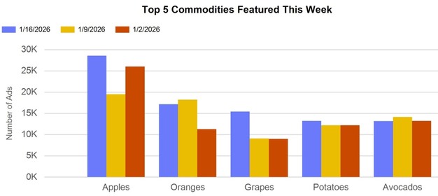 Retail advertising activity this week showed a strong emphasis on citrus, reflecting seasonal availability during the winter period. Advertised citrus items included both standard products such as lemons, limes, and oranges, as well as specialty citrus, including dekopons, blood oranges, Meyer lemons, pummelos, and Cara Cara oranges.