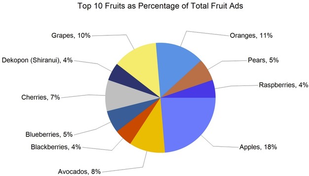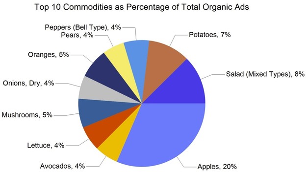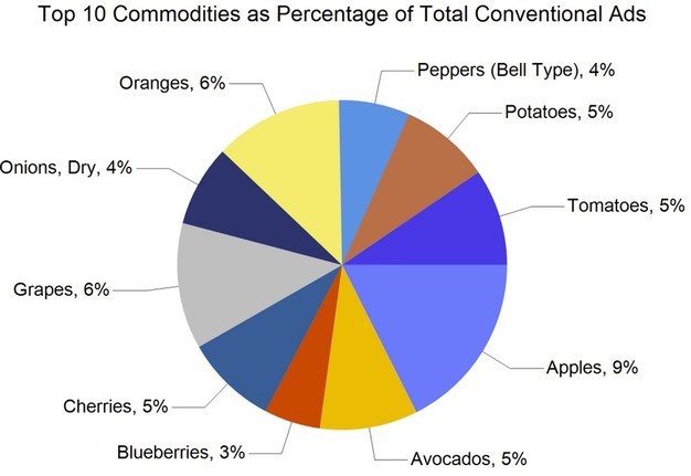 By commodity group, fruit accounted for 161,939 advertisements, equal to 58 per cent of the total. Vegetables followed with 85,124 ads, or 31 per cent. Onions and potatoes represented 24,525 ads, accounting for 9 per cent. Other categories included herbs with 675 ads, ornamentals with 1,752, hemp with 1,796, and honey with 1,822. Organic produce was featured in 35,418 ads, representing 13 per cent of total advertised items.